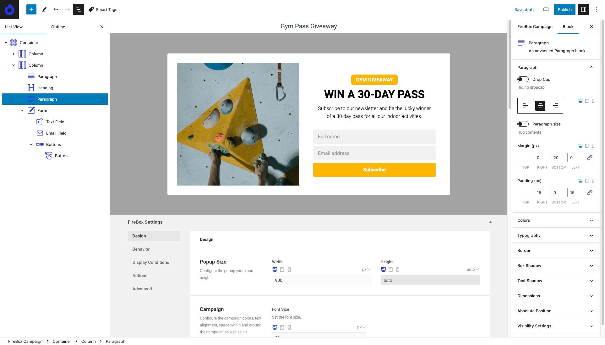 The easiest way to create an on-click popup is to use FireBox. This popup plugin for WordPress stands out due to its integration with the Gutenberg Editor. This allows you to effortlessly design and structure the content of your popups using the familiar block interface.